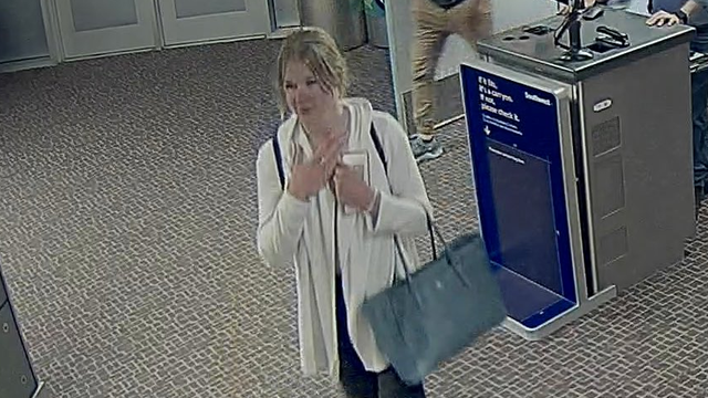 Mackenzie Lueck can be seen wearing black sweat pants and a light-colored sweater, carrying a small black backpack, large blue purse and brown suitcase