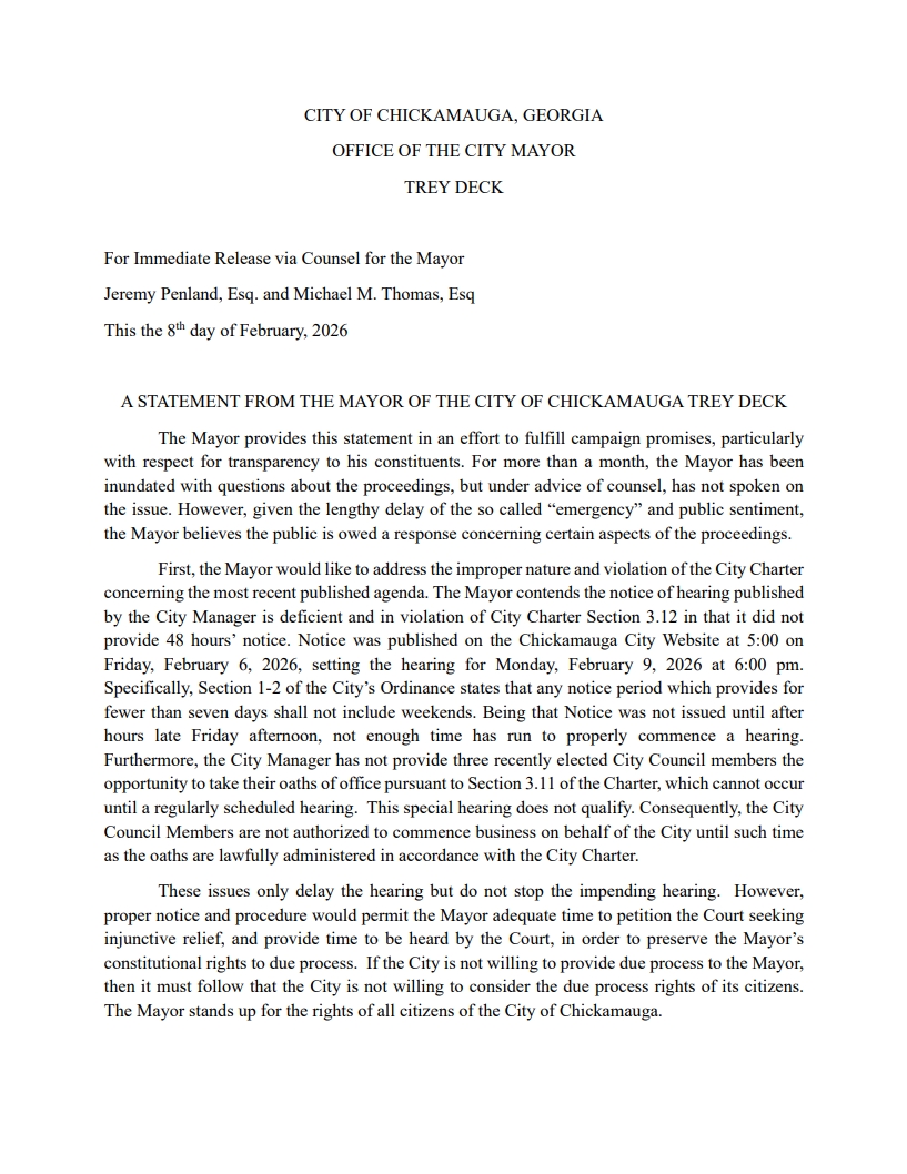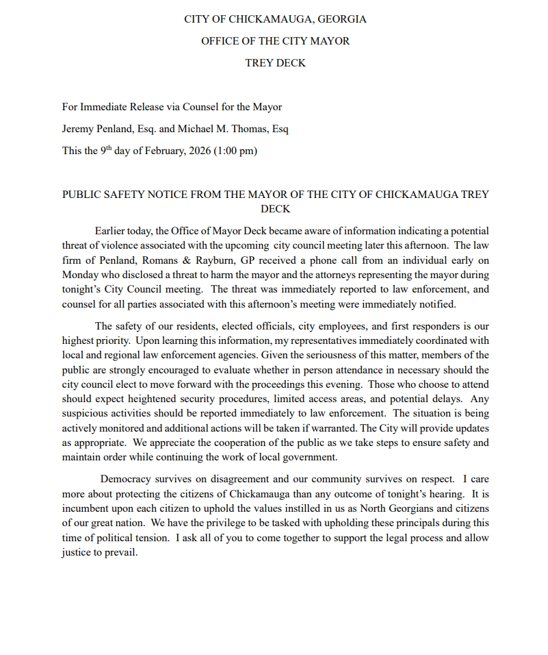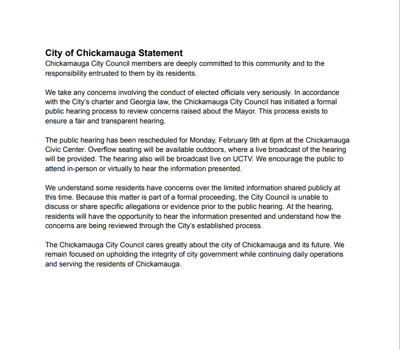 public hearing process to review concerns raised about the Mayor.This process exists to ensure a fair and transparent hearing. The public hearing has been rescheduled for Monday, February 9th at 6pm at the Chickamauga Civic Center. Overflow seating will be available outdoors, where a live broadcast of the hearing will be provided. The hearing also will be broadcast live on UCTV. We encourage the public to attend in-person or virtually to hear the information presented. We understand some residents have concerns over the limited information shared publicly at this time. Because this matter is part of a formal proceeding, the City Council is unable to discuss or share specific allegations or evidence prior to the public hearing. At the hearing, residents will have the opportunity to hear the information presented and understand how the concerns are being reviewed through the City’s established process. The Chickamauga City Council cares greatly about the city of Chickamauga and its future. We remain focused on upholding the integrity of city government while continuing daily operations and serving the residents of Chickamauga.”