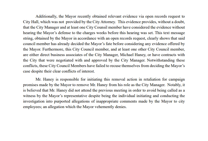 “This evidence provides, without a doubt, that the City Manager and at least one City Counsil member have considered the evidence without hearing the Mayor’s defense to the charges weeks before this hearing was set.”